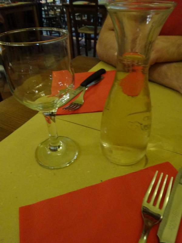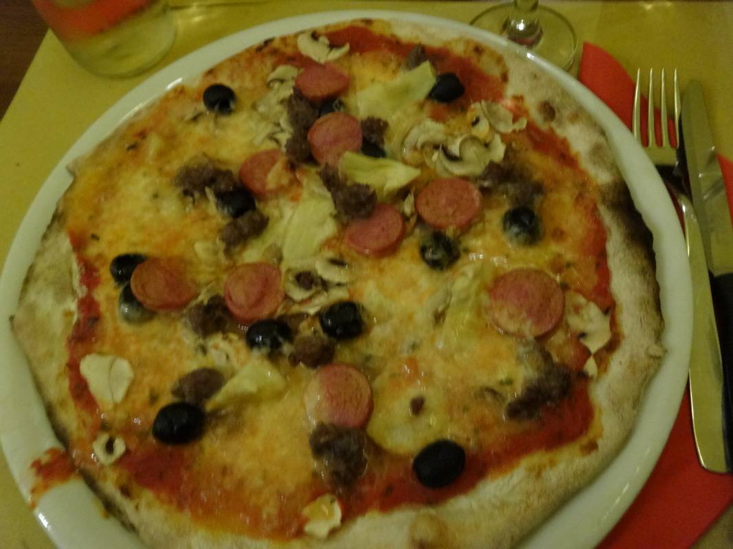 E como gostamos do restaurante e ficava ao pé do hotel, voltamos lá para jantar, já sem menu, e optamos por uma Pizza e uma Calzone, bem como 1/4 de vinho da casa por 4 € e uma cerveja por 5 €.