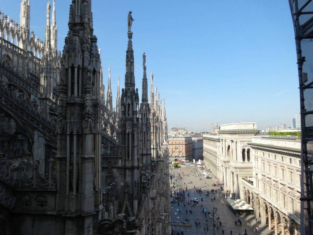 Depois de subir pelos elevadores ficamos na 1ª nível, onde já é possível ver a Galeria Vittorio Emanuele num outro prisma, tal como os pináculos e as estátuas do Duomo. Nos terraços encontram-se 135 pináculos e gargulas.