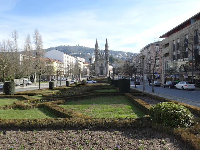 Começamos pelo Jardim do Largo da República do Brasil, porque era onde ficava o centro comercial onde estacionamos. Daqui vê-se a Igreja de São Gualter/Igreja da nossa Senhora da Consolação ao fundo, bem como no alto do monte vê-se o Santuário da Penha.