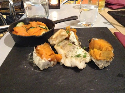 Escolhemos uma entrada agridoce para partilhar e peixe veja com batata-doce e legumes como prato principal.