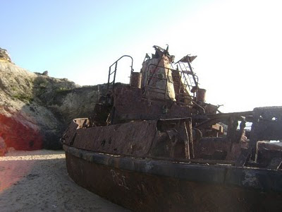 Em vila Nova de Milfontes ainda existem praias selvagens ou semisselvagens, com poucas pessoas a circularem por elas, bem como, em uma delas há um barco encalhado.