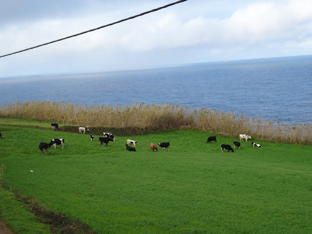 Por fim, ainda encontramos mais vaquinhas a pastar a beira-mar. São as vaquinhas que encontramos em toda a ilha que dão aos Açores um ar tão caraterístico.